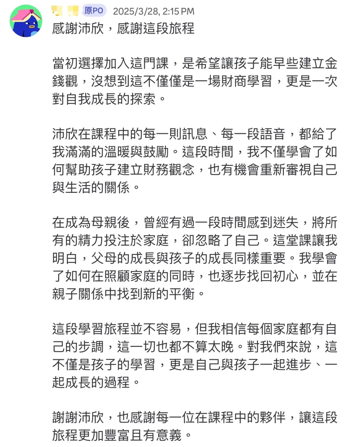 以前也沒人教育我們財商,或許也曾對錢很焦慮,但你希望這一代開始不同。你願意從自己出發,給孩子更自由的選擇力也建立自己的自信。